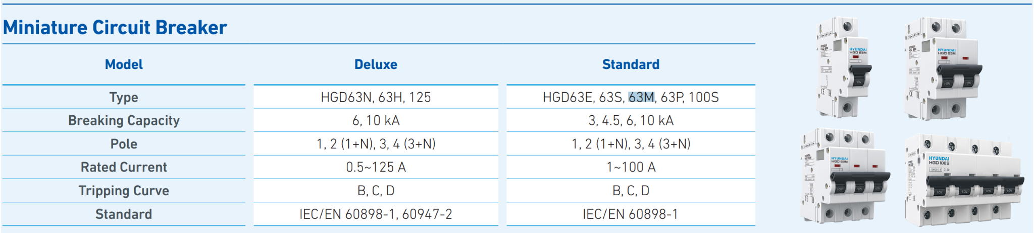 Aptomat Hyundai MCB 2P dòng HGD63M là dòng thiết bị đóng cắt dạng tép (Miniature Circuit Breaker) phổ biến nhất của Hyundai, chuyên dùng để bảo vệ quá tải và ngắn mạch cho lưới điện 1 pha (2 dây) trong dân dụng và công nghiệp nhẹ.