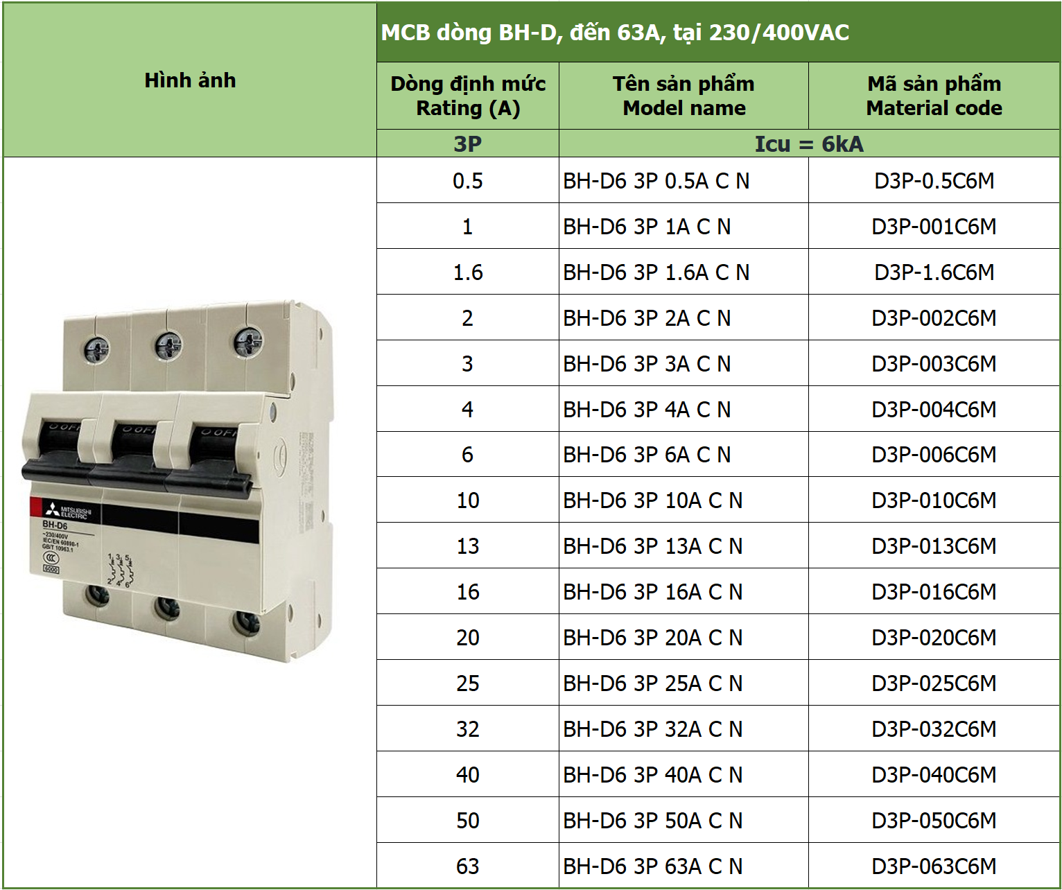 Attomat MCB Misubishi BH-D6 3P 0.5A~63A