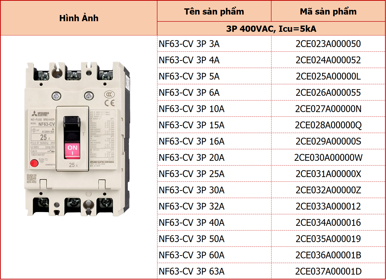 Aptomat MCCB Mitsubishi NF63-CV 3P là dòng cầu dao tự động dạng khối (MCCB) nhỏ gọn thuộc series NF-V (dòng tiêu chuẩn), được thiết kế để bảo vệ mạch điện với dải dòng điện định mức từ 3A đến 63A. Đây là lựa chọn phổ biến cho các ứng dụng tủ điện phân phối nhỏ và bảo vệ tải nhẹ.