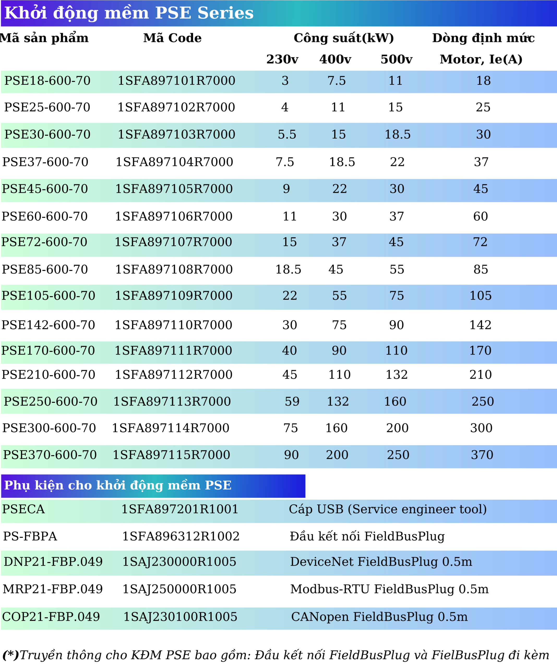 ♦ Bảng chọn mã hàng Khởi động mềm PSE series