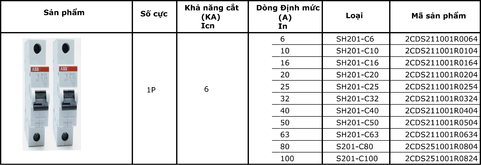 ♦ Bảng chọn mã hàng MCB ABB SH201