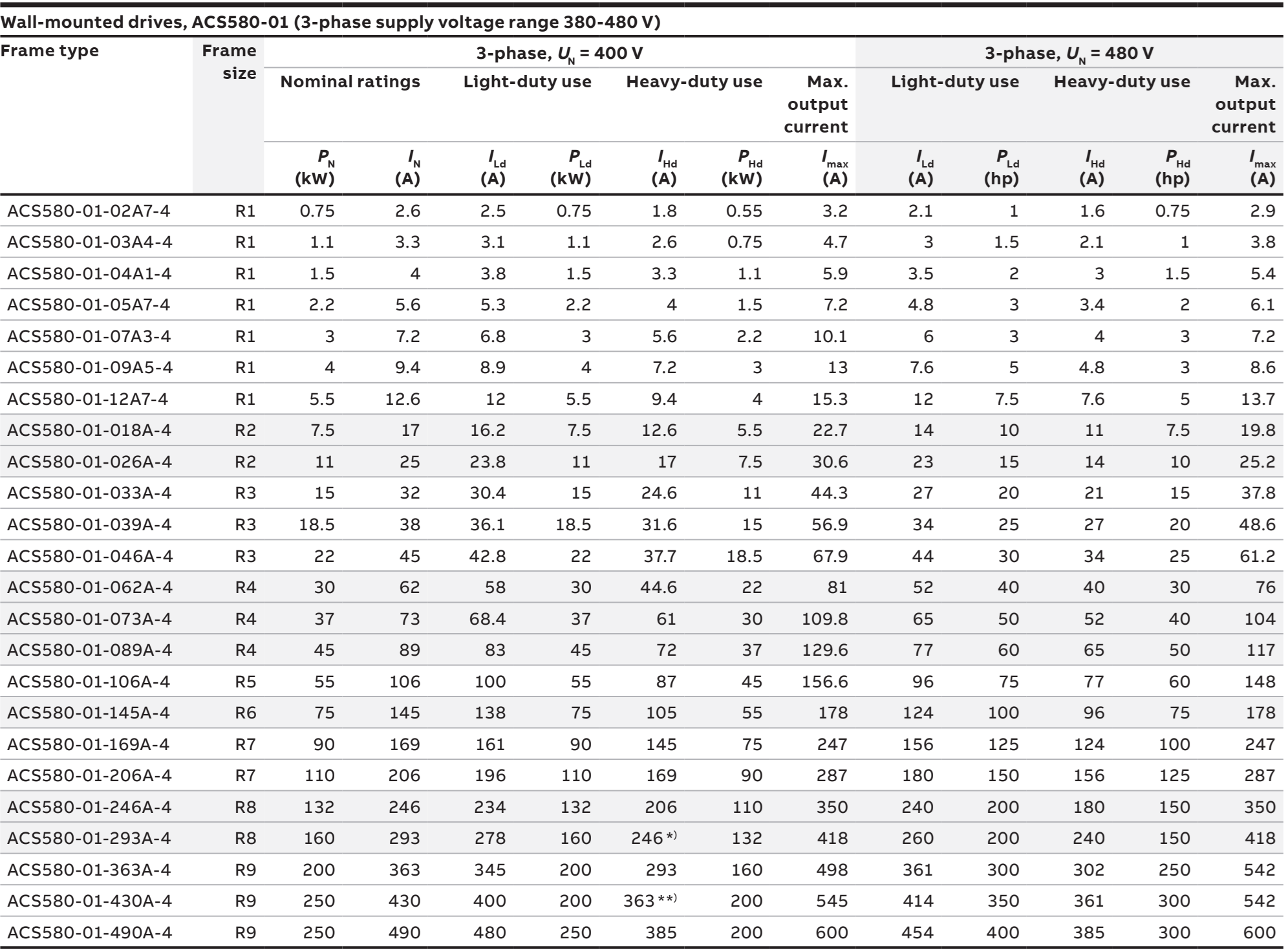 ♦ Bảng chọn mã hàng và Frame Size của biến tần ABB ACS580 series